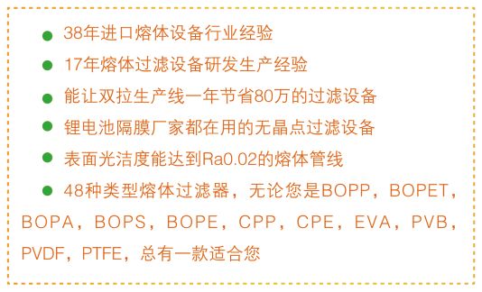 至今已有十三年在薄膜行业研发生产熔体过滤设备的经验,改造过包括三菱,DMT,布鲁克纳,制钢所,多尼尔等国外及国内生产线上的熔体过滤器,熔体管道,分配器,静态混合器等设备及多种设备配件。