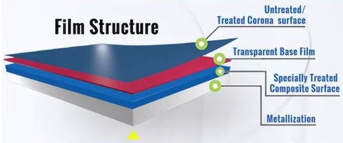 该薄膜在经过特殊处理的复合表面上进行金属化处理,对另一表面则不进行处理或者进行电晕处理。这种处理方式可以使金属附着力或者粘合强度达到47.2克力/毫米(1200gram-force/in)以上。