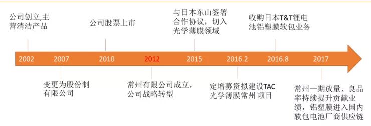 扩建产能投产后,公司常州锂电池电芯用高性能封装材料项目的最大产能可达600万平方米/月,加上日本三重200万平方米/月产能,公司将成为世界上最大的锂电池用铝塑膜生产厂商。2017年公司拿下国产铝塑膜的最大订单,在动力软包锂电池市场取得突破。