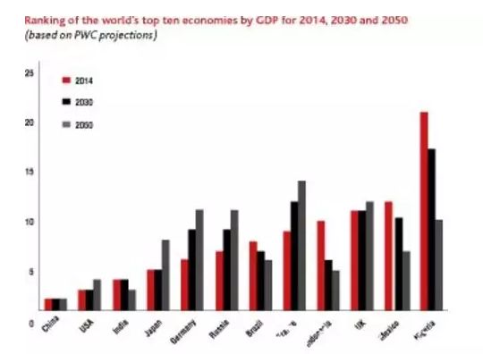 世界GDP前十位经济体2014、2030及2050年排名(普华永道预测)