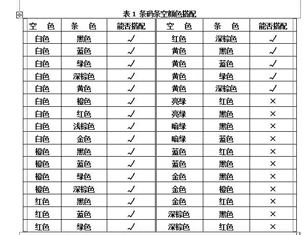 ④ 条码的颜色搭配。条码是用专用读取设备依靠分辨条、空的界线和宽窄来识别的。因此,条与空的颜色反差越大越好,一般来说,白色作底,黑色作条是最理想的颜色搭配。条码读取设备的识读光源被规定为波长633nm的红光,条能吸收红色的光,为暗色;空不能吸收红光,为亮色。红色绝对不能作条色,金色既不能作条色也不能作空色。具体的颜色搭配见下表: