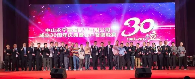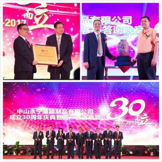 PFC导读:2017年3月28日晚,中山永宁薄膜制品有限公司于假座中山市小榄镇百汇广场5楼时代花城酒店隆重举行成立30周年庆典!