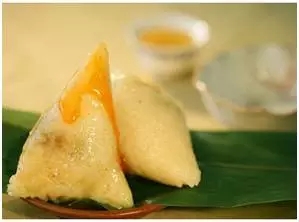 广东粽子:冬叶包裹着糯米、绿豆、咸蛋黄、冬菇、花生、五花肉及莲子,是传统裹蒸粽做法,丰富的材料满足了口感的需求。