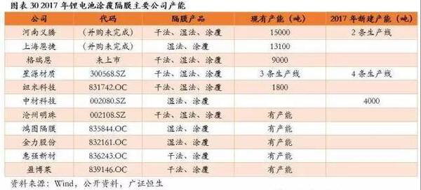 比较隔膜业务占比较大的主板上市公司星源材质和沧州明珠:2017年一季报显示,产品中有较大比重的中高端湿法隔膜的沧州明珠,其毛利率与2016年第四季度相比基本一致;而产品以干法隔膜为主的星源材质,其毛利率水平与2016年第四季度相比由60%降低到53%,盈利空间受到较大挤压。这从侧面印证了,在隔膜整体降价的大趋势下,高质量湿法隔膜企业相比干法隔膜企业的盈利能力将具有更强的保障性。