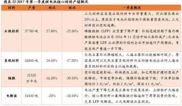 进入2017年以来,受到新能源汽车行业的补贴退坡、推荐目录“重做”的影响,新能源车企的订单派发都比较谨慎,因此整个锂电池产业链的行业风向、出货量和盈利水平都受到了一定程度的影响,特别在锂电池四大核心材料:正极、负极、隔膜和电解液等细分领域反映得十分显著。2017年第一季度产销情况相比2016年第四季度整体呈下滑态势,但更加符合高能量密度动力电池要求的三元正极材料、人造石墨和中高端湿法隔膜表现更优。