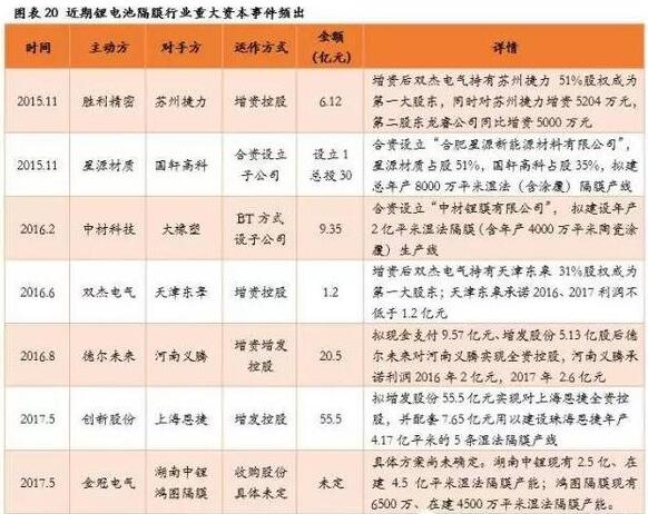 隔膜作为锂电池四大核心材料中唯一没有实现完全国产化的领域,近年来受到资本市场的高度关注和追捧。自2015年以来,隔膜行业并购和合资事件频出,以材料业上市公司为代表的兼具相关产业背景和雄厚资金实力的企业,纷纷加速对锂电池隔膜市场的布局速度;技术领先且市场占有率较高的优质隔膜企业如苏州捷力、河南义腾等陆续被并购,且交易价格不断攀升,2017年5月创新股份发布公告拟并购上海恩捷的支付对价高达55.5亿元。此外,产业链中的相关公司也以新设子公司等方式谋求技术和资金的合作,增强其在行业中的竞争实力。