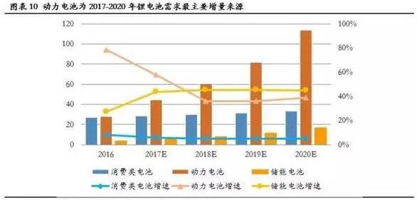 锂电池的下游应用主要包括动力电池、消费类电池和锂电储能三大领域。2014年之前,受益于3C数码产品的需求扩张,消费类锂电池市场规模持续较快增长。2014年以来新能源汽车产业受政策支持和技术进步推动而高速发展,2014、2015年连续两年增速超300%。根据2016年的统计数据,动力电池已经跃升至锂电池消费结构中第一大需求,占比达48%。