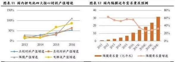 锂电池需求量的持续高速增长带来了整个锂电池产业链的高度景气,特别是作为整个产业技术核心环节的锂电材料领域,近年来行业增速不断加快;2016年锂电池四大核心材料:正极、负极、隔膜和电解液的行业产值增速均超过50%。未来我们预期锂电池隔膜的需求量将保持30%左右的增速,至2020年隔膜需求量有望超过30亿平方米。
