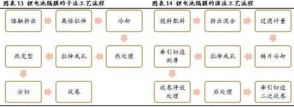 锂电池隔膜的生产技术主要分为干法和湿法两大工艺。干法工艺是将原料(PE或PP)进行高温成膜后退火处理,进一步拉伸形成微孔膜;可细分为单向拉伸和双向拉伸,其中干法双拉工艺是中国科学院在20世纪90年代初开发出的具有自主知识产权的工艺。湿法工艺利用相分离的原理,将小分子物质与PE混合,加热熔融后降温进行相分离,得到微孔膜。