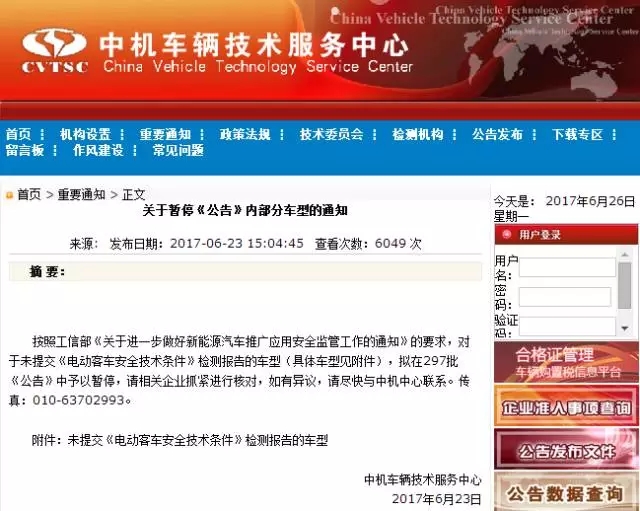 按照工信部《关于进一步做好新能源汽车推广应用安全监管工作的通知》的要求,对于未提交《电动客车安全技术条件》检测报告的车型(具体车型见附件),拟在297批《公告》中予以暂停,请相关企业抓紧进行核对,如有异议,请尽快与中机中心联系。传真:010-63702993。
