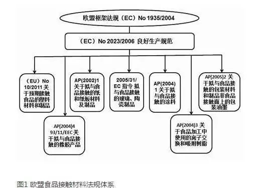 欧盟食品接触材料法规包括框架法规、专项指令和单独指令3个层次。其中,框架法规规定了对食品接触材料管理的一般原则,专项指令规定了框架法规中列举的每一类材料的系列要求,单独指令是针对单独的某一具体有害物质所做的特殊规定。