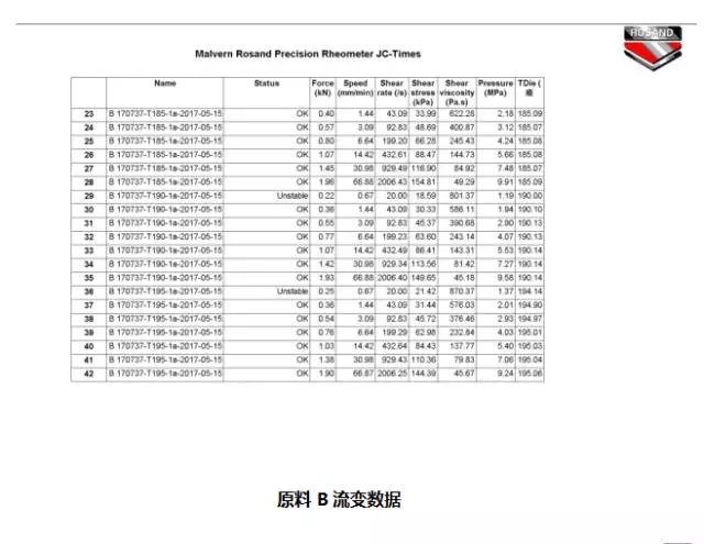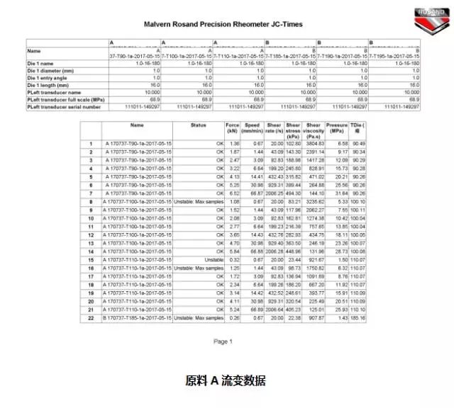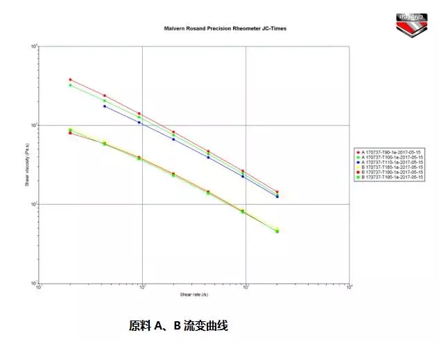首先对两种复合的物料进行流变分析,用马尔文的毛细管仪检测两种物料,得到如下曲线、流变数据,检测使用的毛细管直径1.0mm,长度16mm。A料检测90、100、110℃三个温度,B料检测185、190、195℃三个温度。如下图: