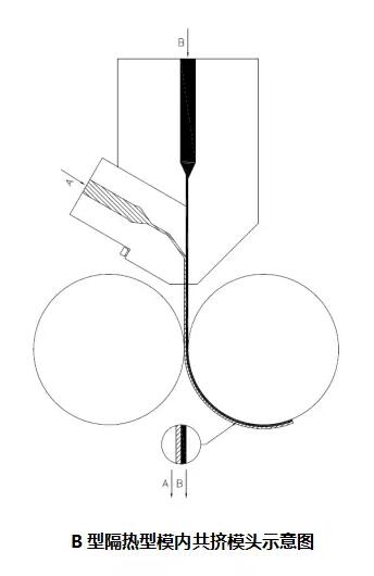 B型隔热型模内共挤模头其设计要点是两种原料必须单独进料,两流道之间设置有隔热装置,流道交汇处靠近模唇出口,两流道分别单独温控,这种结构设计的隔热型模内共挤模头经实际验证其隔热的温差最大可以达到60℃。