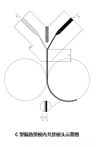 C型隔热型模内共挤模头,两种原料单独进料,其模体也尽量隔开,并设计有效的隔热结构和隔热材料,两种原料汇合处尽量靠近模唇出口,其距离D一般建议小于70mm,使得其热传递干扰降至最低,其次模体材质的选择也是非常关键的,由于温度差异非常大,必须考虑钢材的热胀冷缩引起的变形问题。此类隔热型模内共挤模头经验证隔热温差可以达90℃以上。