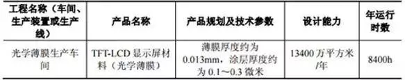 其中,光学膜项目主要生产平板显示面板的关键部件偏光片,总投资20亿元,项目建成达产后,将形成年产各类偏光板3200万平米的生产能力,达产后年 产值约 26.56亿元人民币。