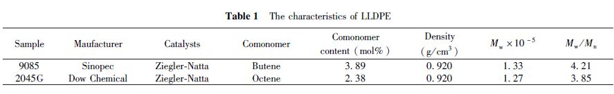 本文中所用的线性低密度聚乙烯的生产厂家及基本物性参数见表1.