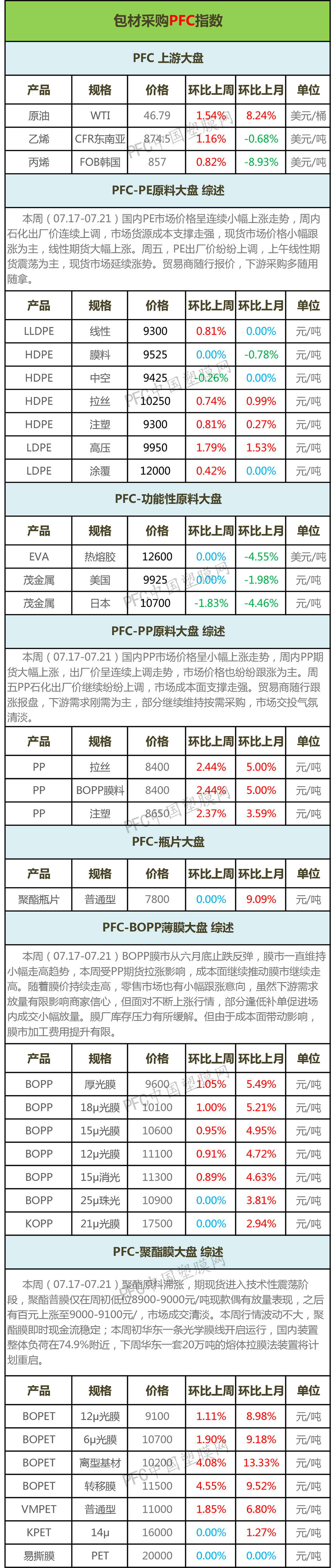| 中国塑膜网采价之供应商报价基本条件: 1、现款报价(不含账期和承兑汇票) 2、正常包装(不含特殊包装,如托盘包装或外包缠绕膜) 3、出厂报价(不含任何海、陆、空等运费) 4、主流报价(一般为批量价格,不涉及过小规格及零售的价格) 5、报价基本为A级或者优级(B级、C级、合格品或等外品均未涉及报价) 6、质量技术指标只是通用型(不包含有特定的质量技术要求的产品,例如:摩擦系数,印刷浅网的再现性等等) 7、部分产品价格为少量,短途送到价格