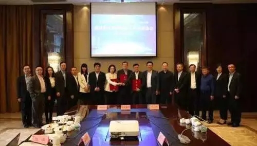 张家港市、康得新集团与万科集团共同签署《康得新未来城战略合作框架协议》。朱立凡书记(右七)、黄戟市长(右九)、钟玉董事长(左七)、CEO徐曙女士(左八)、万科高级副总裁张海(右六)在签约仪式上合影