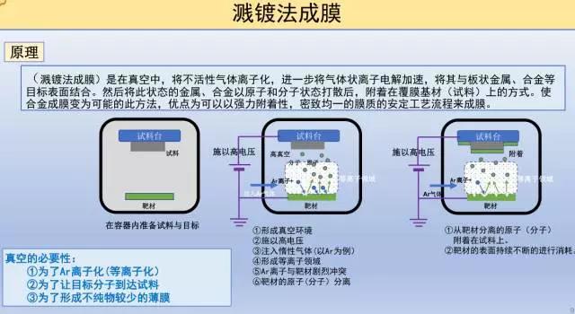 溅射(Sputtering)镀膜技术利用离子源产生的离子,在高真空中经过加速聚集,而形成高速度能的离子束流,轰击固体表面,离子和固体表面原子发生动能交换,使固体表面的原子离开固体并沉积在基底表面而形成薄膜材料。