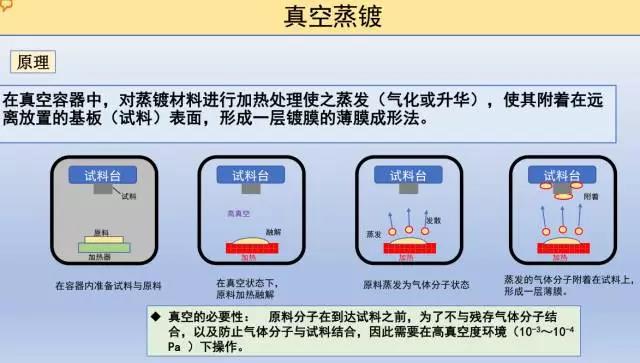 真空蒸发镀膜是指在真空条件下,通过蒸发源加热蒸发某种物质使其沉积在基板材料表面来获得薄膜的一种技术。被蒸发的物质被称为蒸镀材料。