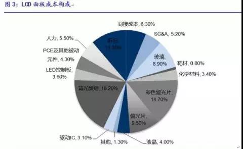 对LCD面板成本进行拆分可以看出,物料成本占到LCD总制造成本的70%以上,折旧成本占11%,人力成本、间接成本、销售管理成本各占5-6%。物料成本中背光模组占比最高为18.2%,彩色滤光片占14.7%,偏光片占9.5%,玻璃基板占8.9%。