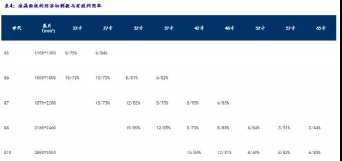 从产品良品率及玻璃基板的利用效率综合考虑,玻璃面板的经济切割数目需要达到6个以上。如以8代线玻璃基板为例,尺寸大小为2160*2460mm2,切割37英寸LCD-TV,可以切割出12片,利用率为85%;切割46英寸LCD-TV仅能切出8片,利用率仅为88%;而生产57英寸仅产3片,产能利用率为51%;可生产65英寸2片,产能利用率仅44%。综合来看,8代线生产37、46、52英寸产能有较高的利用率,而其他尺寸则利用率较低。因此,应用产品尺寸越大,要达到经济切割,需要的生产线的世代也越高,这也是近几年为满足液晶电视市场新建生产线主要集中在8世代以上的原因。
