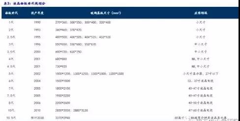 根据玻璃基板的尺寸大小,平板显示生产线可以划分为不同的世代。如中小尺寸应用常用的2.5代线,玻璃基板的大小有400mm *500mm、410mm*520mm等几种,大尺寸TV面板应用的8代线为2200mm*2600mm。平板显示的世代只与尺寸大小有关,尺寸越大、制作价值更高的大尺寸应用产品的利用效率也越高;但生产工艺与产品的先进性与世代没有必然关系。