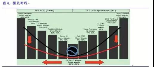 TFT-LCD产业中有一个著名的理论叫微笑曲线。微笑曲线中间部分是面板制造;左边是上游材料供给,属于全球性竞争;右边是产品应用与营销,主要是当地性的竞争。微笑曲线两端朝上,在产业链中,高附加值部分体现在两端,即材料供给和销售,毛利率可以达到50%以上。处于中间环节的制造附加值最低,毛利率在-25~+30%之间,获得的附加值最低,产业周期性波动较大。因此,按照TFT-LCD产业链盈利能力来讲,玻璃基板、液晶、背光模组等上游材料公司具有显著的高附加值优势。