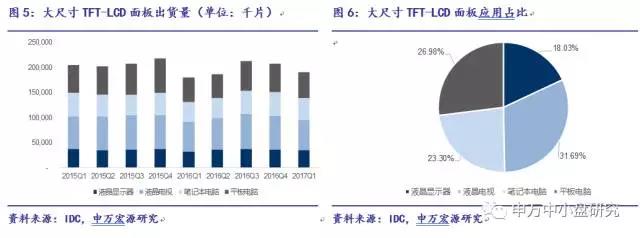 大尺寸TFT-LCD面板主要应用于四个方面,分别是液晶显示屏,液晶电视,笔记本电报,平板电脑。从行业发展趋势来看,未来小尺寸方面OLED占比逐步提升而LCD减少,大尺寸方面依然以LCD为主。根据IDC统计的大尺寸TFT-LCD面板季度出货量数据来看,从2015年一季度到2017年一季度TFT-LCD面板出货量呈现出波动变化的特征,其中2017年一季度全球出货量为1.9亿平米,应用于液晶显示屏,液晶电视,笔记本电报,平板电脑的比例分别为18.03%、31.69%、23.30%、26.98%。