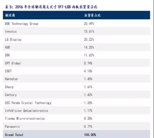 从生产厂商情况来看,京东方是全球最大的大尺寸TFT-LCD生产商。目前,京东方建成了全球第一条10.5代TFT生产线、是目前全球最高世代TFT生产线、全球最大的高科技电子厂房项目,并计划2018年实现首批产品的点亮投产。2016年全球前五大大尺寸TFT-LCD生产商出货量占比分别为京东方20.5%、LG 20.2%、群创15.6%、友达14.3%和三星11.6%。