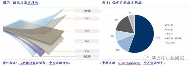 偏光片是由多层薄膜构成,其原材料成本占生产总成本的80%。原材料主要有TAC膜、PVA膜、感压胶、保护膜和离型膜组成,其中TAC约占成本50%左右、 PVA占12%、胶水5-10%,保护膜、离型膜15%,化工材料5%,其他成本占10%。偏光片的核心技术为TAC(三醋酸纤维素酯)膜、PVA(聚乙烯醇)膜的制备,其技术和市场几乎完全被日本掌控。在生产偏光片所需的各膜层中,TAC膜和PVA膜是最主要的膜层,占偏光片原材料成本的60%以上。日本富士占据TAC薄膜80%以上市场,KONICA占据约20%的市场。日本可乐丽(Kuarary)占据PVA薄膜65%的市场。而偏光片厂的毛利率也受制于上游膜材料的垄断,要比液晶和玻璃基板低,约为20-30%,但随着台湾厂商在TAC技术上的突破,未来此处成本有望下降。