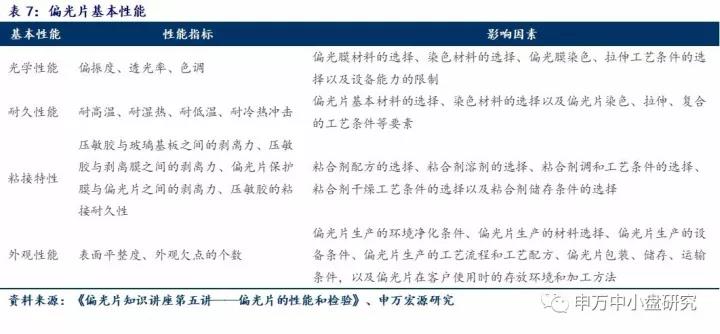 偏光片的基本性能指标主要有:光学性能、耐久性能、粘接特性、外观性能以及其它特殊性能几个方面。光学性能包括:偏振度、透光率和色调三项主要性能指标,其它还包括防紫外线性能以及半透射型偏光片半透膜的透光率、全反射率和漫反射率指标。耐久性技术指标包括耐高温、耐湿热、耐低温和耐冷热冲击四项,其中最重要的是耐湿热性能指标的高低。粘接特性技术指标主要指偏光片压敏胶的各项特性,一般包括:压敏胶与玻璃基板之间的剥离力、压敏胶与剥离膜之间的剥离力、偏光片保护膜与偏光片之间的剥离力以及压敏胶的粘接耐久性。外观性能技术指标主要是指偏光片产品的表面平整度和外观欠点的个数,这些技术指标主要影响偏光片产品在贴片时的利用率。