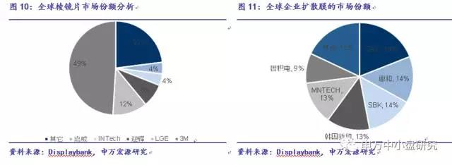 从棱镜片供应商角度看,目前棱镜片主要供应为美国、日本企业。根据Displaysearch数据,在棱镜片市场中,3M占比50%,LGE占比12%,迎辉占比8%,其他棱镜片厂商依次是INTech、嘉威等。随着3M部分专利到期,使得台湾和韩国厂商竞相进入这一市场,并开始占有一定市场份额。