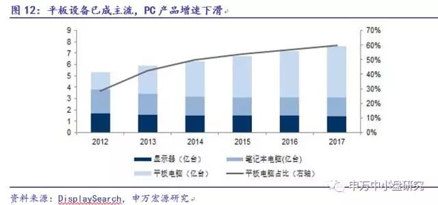 平板设备已成主流,PC产品增速下滑。近年来,随着新技术、新应用的不断涌现,平板电脑快速的融入并改变着大众的生活、工作和娱乐方式,越来越多的人开始选择平板电脑作为主要的移动计算设备,平板电脑出货量呈现爆发式增长,而台式电脑和笔记本电脑则受到冲击,出货量出现下滑。根据DisplaySearch统计及预测,2017年全球台式电脑、笔记本及平板电脑的出货量分别为1.44、1.63、4.55亿台。