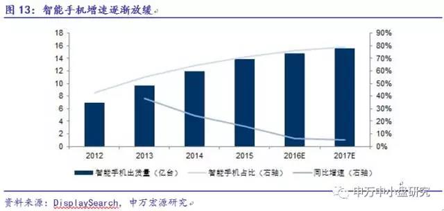 智能手机渗透率逐年提升,大屏化成趋势。全球范围来看,虽然近几年智能手机增速逐渐放缓,预计2016年仅3%左右,但是大屏化已成为趋势,并且增长主要来源于亚太地区,比如中国、印度等市场,从消费结构来看,千元左右的智能机较为畅销。预计2017年全球智能机销量增速约5%左右。智能机的屏幕大小从10年4寸左右,现在已增长至6寸甚至更大面积,并且各品牌无边框设计也在陆续推出,大屏化已成为趋势。