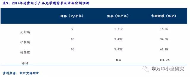 预计2017年全球LCD中背光模组用光学膜需求为8.6亿平方米,市场规模达112亿元。作为液晶模组的重要构成部分,液晶显示器用光学膜片市场需求将随着液晶模组的市场需求波动而变化。我们按照背光模组中“1张上扩散膜+2张增亮膜+1张下扩散膜+1张反射膜”的使用量来推测对光学膜的需求。按照Displaysearch的数据统计预测,假设反射膜、扩散膜、增亮膜的价格分别为9、10、18元/平米。预计2017年全球光学膜整体市场空间约112亿元。