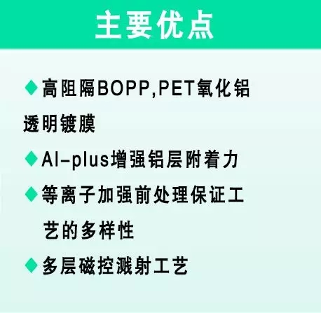 最新型透明高阻隔氧化铝ALOx真空镀膜机,集稳定、高效、灵活于一体,适合于各类包装膜,透明高阻隔PET及BOPP膜及直镀环保香烟内衬纸、酒标纸和柔性透明导电ITO触屏膜,LOW-E窗膜等多层溅射镀膜。