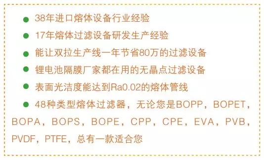 至今已有十三年在薄膜行业研发生产熔体过滤设备的经验,改造过包括三菱,DMT,布鲁克纳,制钢所,多尼尔等国外及国内生产线上的熔体过滤器,熔体管道,分配器,静态混合器等设备及多种设备配件。