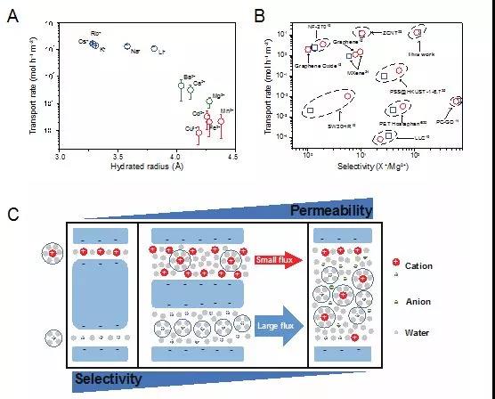 通过优选高分子膜并利用新的制备工艺,刘峰、王宇钢课题组所获得的新型纳米尺度核孔膜,在保持碱金属离子与重金属离子高选择性的同时,将离子的输运率提高了3个数量级(图A)。 这种纳米核孔膜的优异分离性能突破了传统的分离膜和氧化石墨烯等新型分离膜的局限(图B)。
