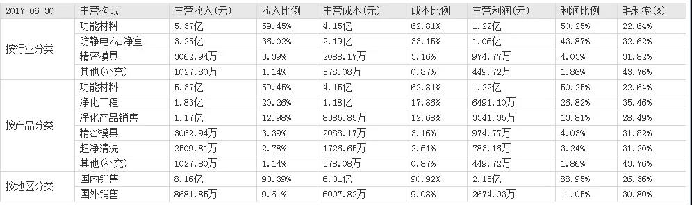 公司的功能材料业务17年上半年已占公司整体营收的60%。