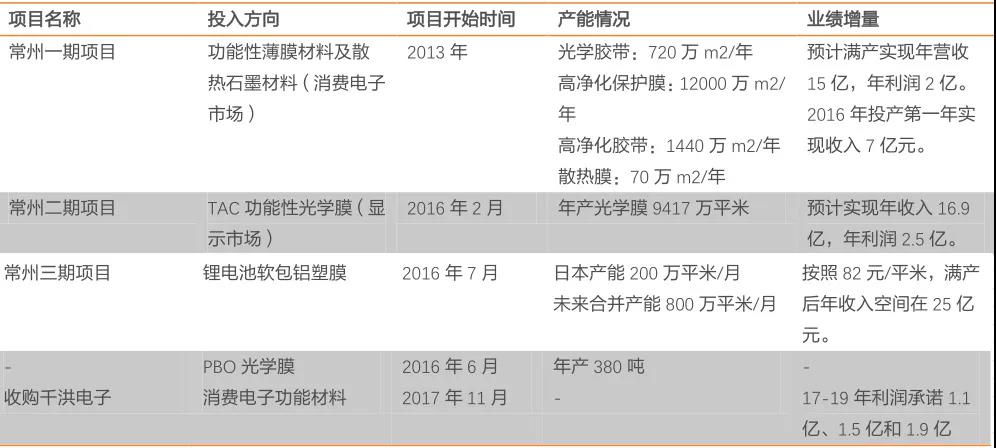 2)功能性光学薄膜项目(常州三期):规划设计已于 2017 年 7 月完成,已经完成全套设备订货。预计 2018 年一季度末可完成土建施工进入机电安装阶段,2018 年三季度末转入设备调试运行。按照公司此前规划,该项目满产后年收入在 16.9 亿元。