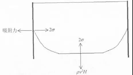 图2为幕帘边界处受力情况,幕帘稳定性取决于两方面,一方面是幕帘底部的稳定性,此时要求ρv2H >2σ;另一方面,在导杆边缘处,从力的平衡来看,若想保持幕帘的稳定,导杆与幕帘之间的吸附力必须大于2σ,即吸附力>2σ。