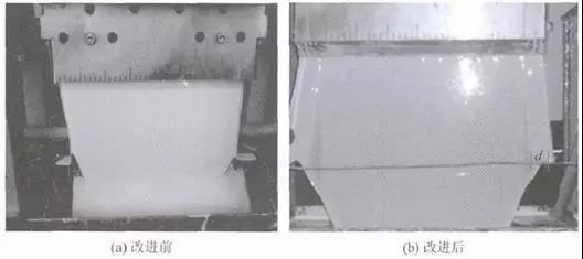 涂料配方 颜料100份,其中高岭土20~80份,重质碳酸钙80~20份;丁苯胶乳15份,PVA1份,增白剂1份,消泡剂0.3份,润滑剂0.8份,抗水剂0.7份,表面活性剂0.3份。 幕帘稳定性判断方法 实验过程中,螺杆泵与变频器连接,通过调节变频器的频率来调节流量。随着涂料流量的降低,幕帘与导杆的脱离位置会逐渐上升,上升到一定的位置,幕帘会突然脱离导杆,造成幕帘的破裂。涂料流量由大到小的变化过程中,幕帘与导杆有两个重要的脱离点:一是幕帘突然脱离两边导杆的流量,定义为最小流量,用单位长度的流量来表示;最小流量值越小,幕帘稳定性越高,涂料最小流量是通过大流量逐渐降低来获得的。二是幕帘到达距离模头缝隙以下15cm处即涂布走纸位置的流量,定义为可操作最小流量,用单位长度的流量来表示。考虑到实用情况,以可操作最小流量为主来判断幕帘的稳定性。 导杆对幕帘稳定性的影响 幕帘导杆边缘处是幕帘稳定的薄弱区,此处发生断帘的频率较高,通过对导杆进行改进,可提高幕帘的稳定性,降低可操作最小流量。 改进前后的导杆见图1,造成导杆改进前后可操作最小流量和最小流量变化的主要原因是幕帘与导杆的接触面积不同,改进后的导杆与幕帘的接触宽度d变大,使得幕帘能够与导杆更好的附着,利于幕帘稳定性的提高。