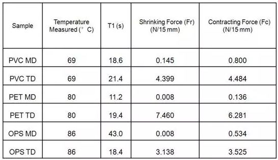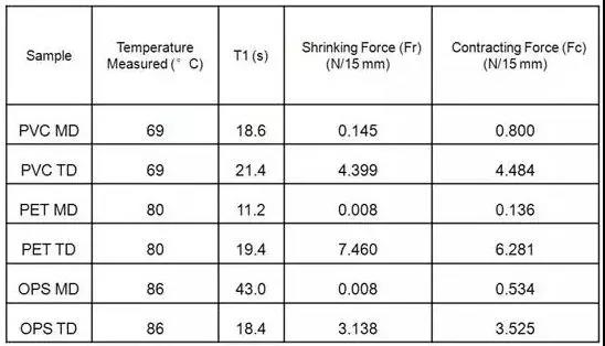 OPS的收缩力(shrinking force,指收缩升温过程中产生的收缩应力)和收紧力(contracting force,指收缩完毕冷却过程中产生的紧缩力)比PVC略小,而PET则要比PVC高得多。
