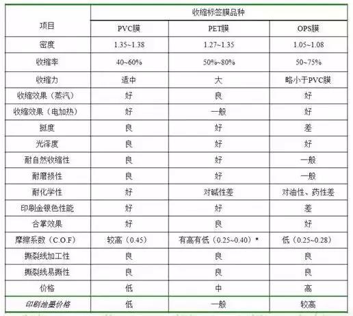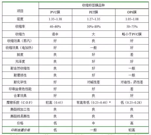 目前市场上PET膜、OPS膜和PVC膜综合性能比较,如表所示 :