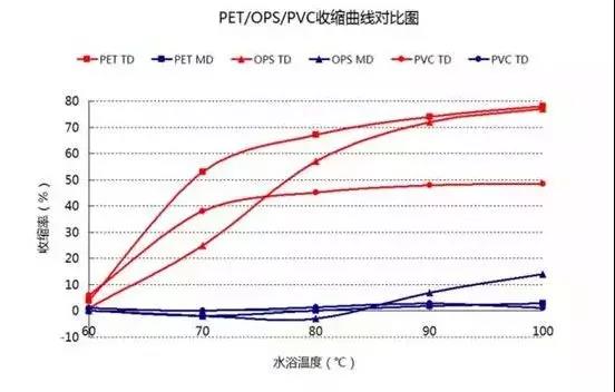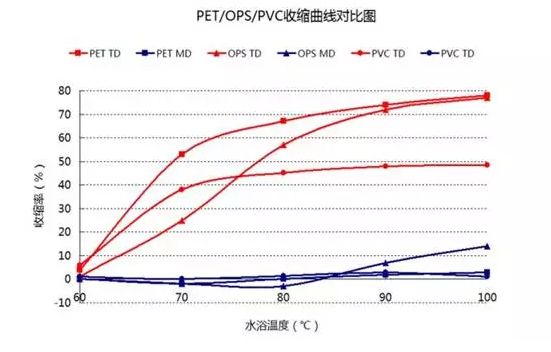 在各种类型的收缩膜中,PET具有最大的收缩率(最高可达80%),因此,一般几何外形复杂的瓶体经常选择PET材料作为标签材料。PET的温度-收缩变化相对平坦。此外,与PVC膜相比,PET膜更利于环保。