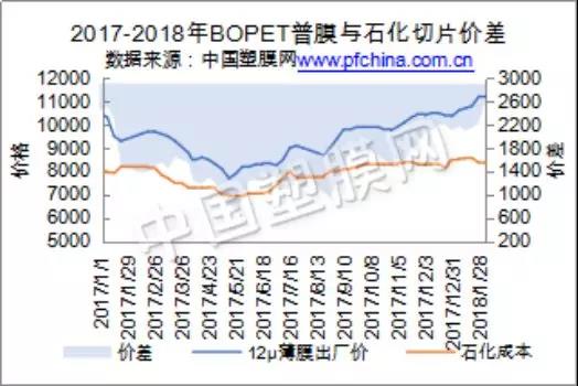 2018年1月,BOPET市场基本面保持良好,在聚酯原料不时走强,以及适量的聚酯膜订单跟进支撑下,膜价逐步冲高,聚酯普膜现金流效益也进一步得到提升,直熔法普膜现金流升至3000元/吨附近,算上综合费用也有千元以上盈利。2018年伊始,聚酯膜价走势由成本导向转为供需导向,从开年坚挺的膜价即可看出。