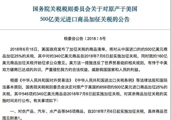 根据相关法律法规的基本原则,国务院关税税则委员会决定对原产于美国的659项约500亿美元进口商品加征25%的关税,其中对农产品、汽车、水产品等545项商品,自2018年7月6日起实施加征关税,对化工品、医疗设备、能源产品等114项商品,加征关税实施时间另行公告。