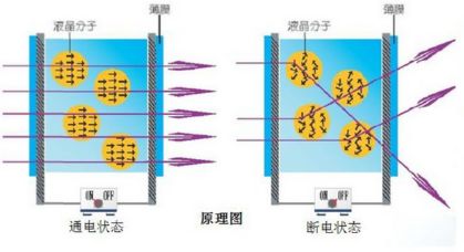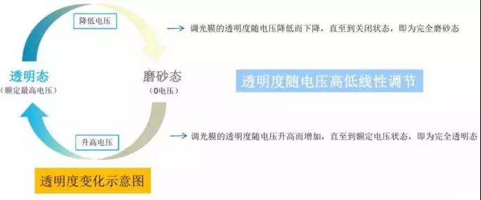 通电时:电场作用下调光膜中间的高分子液晶材料有序排列,可使光线能透过薄膜,达到透明的薄膜状态。