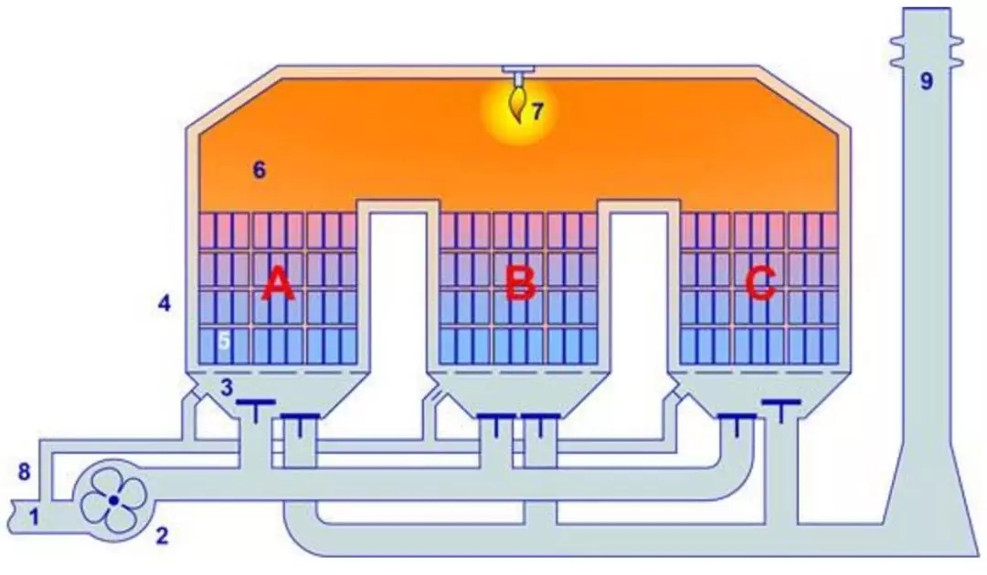 阶段二:废气通过蓄热床B被预热,然后进入燃烧室燃烧,蓄热床A中残留未处理废气被净化后的气体反吹回燃烧室进行焚烧处理,分解后废气经过蓄热床C排出,同时蓄热床C被加热。